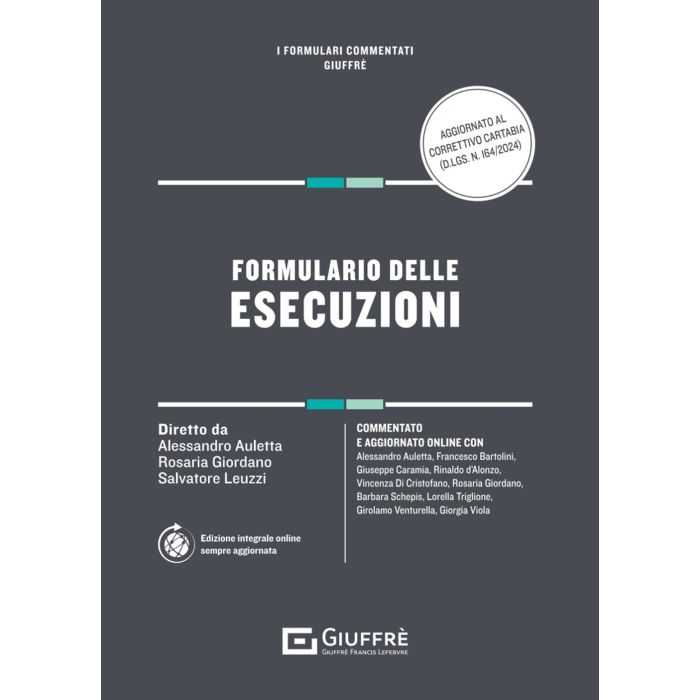 L'Opera, giunta alla seconda edizione, diretta da Alessandro Auletta, Rosaria Giordano e Salvatore Leuzzi, offre circa 600 formule d'autore in materia di esecuzioni a supporto del professionista, con commenti approfonditi che esaminano le diverse criticità nella redazione dell'atto e i nodi problematici più significativi dell'istituto di riferimento. Si tiene conto, in particolare, del costante contributo della giurisprudenza nella costruzione di un sistema dell'esecuzione forzata, delle significative modifiche introdotte nella materia dal d.lgs. n. 149 del 2022 (c.d. riforma Cartabia) e del recentissimo correttivo a tale riforma varato con il d.lgs. n. 164 del 2024, che ha riguardato moltissimi argomenti presenti nel Formulario tra i quali: l'abrogazione della formula esecutiva, la completa digitalizzazione del processo esecutivo, l'introduzione degli obblighi antiriciclaggio a carico degli aggiudicatari nella vendita forzata immobiliare, l'affinamento delle tecniche di tutela, attraverso l'opportuno coordinamento delle norme sulle opposizioni esecutive con quelle generali che riguardano il processo (anche sommario) di cognizione. Alle formule principali presenti sul volume si aggiunge un archivio completo di formule in versione digitale; tutte costantemente aggiornate on line con i focus novità per offrire, con il formarsi e l'evoluzione della giurisprudenza e della dottrina, uno strumento sempre valido e attuale all'operatore del settore.