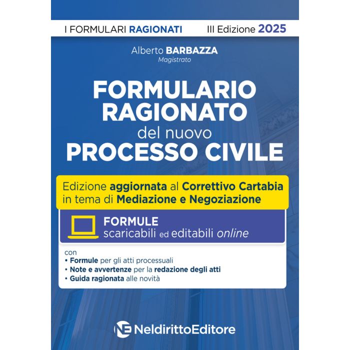 Il Formulario ragionato del Nuovo processo civile, Nel Diritto Editore, è diretto a soddisfare un'esigenza molto forte nei professionisti (avvocati, consulenti, mediatori), alle prese con una non semplice applicazione delle tantissime novità introdotte dalla c.d. Riforma Cartabia e dai due Decreti Correttivi 2024-2025.L'estrema utilità dell'Opera è dovuta alla originalità della struttura, all'ampiezza del perimetro oltre che alla struttura. Per ciascuna formula, infatti, sono: segnalate con apposita evidenziazione le novità che la Riforma Cartabia e i due Correttivi, sul processo e in tema di mediazione e negoziazione assistita, impongono di introdurre o considerare; indicate, in un articolato apparato di note, le avvertenze di cui tener conto in sede di redazione. Si tratta di indicazioni autoriali ,accorgimenti grafici e tecniche redazionali che rendono il Formulario di intuitiva lettura ed utilizzazione. Le formule sono inoltre accompagnate da un articolato sistema di Inquadramenti, diretti ad illustrare il contesto, sostanziale e processuale, al cui interno gli atti processuali si inseriscono, con una particolare attenzione alle innovazioni apportate dalla Riforma Cartabia al sistema processuale di riferimento. In conclusione, degli Inquadramenti sono evidenziate, inoltre, in apposite Tabelle di raffronto, le novità introdotte dalla Riforma Cartabia e dai relativi Correttivi 2024-2025. Quanto al perimetro, il Formulario è organizzato seguendo la struttura del sistema processuale e ricomprende il procedimento ordinario di cognizione (articolato in atti introduttivi, atti processuali e trattazione, fase decisoria, esecutorietà e notificazione delle sentenze, competenza, impugnazioni), il procedimento semplificato di cognizione, le controversie in materia di lavoro, il rito innanzi al giudice di pace, quello in tema di persone, minorenni e famiglie, i procedimenti incamera di consiglio, l'esecuzione, l'ingiunzione, l'arbitrato societario, ilodi stranieri, i mediatori familiari, i consulenti tecnici, il c.d.taglia riti, la mediazionee la negoziazione assistita. Raccoglie oltre140 formule (scaricabilierieditabili), in particolare quelle per le quali iDecreti Correttivi Cartabia impongono un ripensamento o qualche cambiamento. Un sicuro valore aggiunto di questa III edizione dell'Opera è costituito dalle fondamentali formule in tema di mediazione e negoziazione assistita, interamente ripensate alla luce delle novità introdotte, da ultimo, dal D.lgs. 27 dicembre2024, n. 216.
