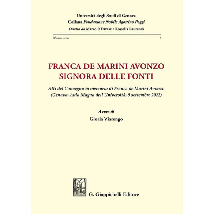 Senza il graditissimo impulso di Giacomo de Marini, promotore e finanziatore di questa iniziativa, il Convegno per ricordare Franca de Marini a dieci anni dalla scomparsa non si sarebbe potuto svolgere con questa ampiezza di contenuti e la tempistica auspicata. Quando abbiamo iniziato a parlarne nell’estate del 2021 l’idea di organizzare questa iniziativa mi era parsa molto azzardata perché eravamo ancora in piena epidemia di covid. Si prospettava la possibilità di dover fare un Convegno on line, un’esperienza sicuramente molto faticosa e insoddisfacente. È prevalso l’ottimismo di Giacomo de Marini che mi ha contagiato e che, unito all’appoggio del collega e amico Marco Pavese, decano della sezione di Diritto Romano, e del Direttore del nostro Dipartimento (allora Riccardo Ferrante), mi ha consentito di dare il via al progetto di ricordare e onorare la mia maestra. Il titolo che abbiamo scelto “Franca de Marini Avonzo Signora delle fonti” evoca un altro titolo, quello dato da de Marini ad un suo articolo uscito nel 1979 nei “Materiali per una storia della cultura giuridica”: I signori delle fonti. Note sullo stile della romanistica italiana. Signori delle fonti erano per lei tutti coloro che nelle varie epoche, a partire dal Medioevo e poi in età umanistica e nei secoli fino al Novecento, con metodi diversi, avevano studiato la letteratura giuridica antica fino ad acquisirne una totale padronanza. “Signora delle fonti” perché ad esse e al lavoro su di esse de Marini ha dedicato le sue ricerche padroneggiandone l’esegesi e la filologia. Sono trascorsi dieci anni dalla sua scomparsa: un tempo sufficiente per fare bilanci rispetto all’apporto da Lei fornito allo studio del diritto romano, con la speranza di far conoscere a coloro che non l’hanno personalmente frequentata i poliedrici aspetti della sua personalità scientifica e per richiamarne la memoria tra coloro che hanno vissuto un rapporto diretto con lei. Mi fa piacere ricordare le iniziative che sono state realizzate per Franca de Marini, a partire dagli Scritti in onore pubblicati nel 1999 “al compimento del magistero ufficiale”, come puntualizza solennemente Mariagrazia Bianchini nella presentazione del volume, frutto della partecipazione corale del Dipartimento genovese.
