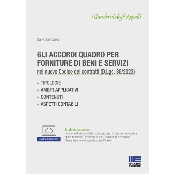 Gli accordi quadro hanno ricevuto nuovo impulso a seguito delle recenti riforme normative, che ne hanno rilanciato l'utilizzo eliminando alcuni vincoli previsti dalla disciplina previgente. Per "accordo quadro" si intende un accordo concluso tra una o più amministrazioni aggiudicatrici e uno o più operatori economici allo scopo di definire le clausole relative agli appalti da aggiudicare durante un dato periodo, in particolare per quanto riguarda i prezzi e, se del caso, le quantità previste. La conclusione di un accordo quadro offre l'indubbio vantaggio per le amministrazioni di semplificare l'iter di affidamento del singolo appalto. L'accordo quadro è uno strumento contrattuale e non una procedura di affidamento. Le procedure di affidamento che possono essere utilizzate per stipulare un accordo quadro sono quelle previste dal codice dei contratti (d.lgs. 31 marzo 2023, n. 36), ovvero aperte, ristrette, negoziate e così via, in relazione alle soglie di importo. L'autore, in questa pubblicazione, focalizza l'attenzione sugli accordi quadro relativi agli appalti di servizi e forniture. L'obiettivo è fornire uno strumento teorico-pratico ad uso di chi è impegnato negli affidamenti. Nella parte introduttiva della pubblicazione vengono illustrate le regole normative inerenti all'istituto giuridico dell'accordo quadro in conformità al D.Lgs. 36/2023; viene poi fornita la modulistica per la gestione dei procedimenti relativi sia agli appalti di servizi sia agli appalti di forniture. Tutti gli schemi sono disponibili anche online per una agevole personalizzazione.
