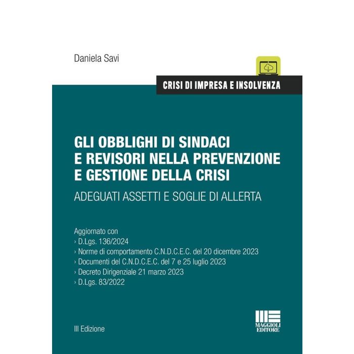 Capitolo 5 Le attività del Collegio Sindacale e del Revisore per l’anticipata emersione della crisi – I segnali di difficoltà 5.1. Le attività di vigilanza dell’Organo di Controllo in merito all’equilibrio aziendale ed al prevedibile andamento delle attività 5.2. Relazione sulla gestione, rendiconto finanziario e indici di bilancio 5.3. I segnali di difficoltà ai sensi dell’art. 3, comma 3 C.C.I.I 5.4. I segnali di difficoltà “tempestivi” ai sensi dell’art. 3, comma 4 C.C.I.I 5.5. Le prospettive di continuità aziendale per i 12 mesi successivi 5.6. Gli altri segnali: i fondati indizi della crisi e le prospettive di continuità