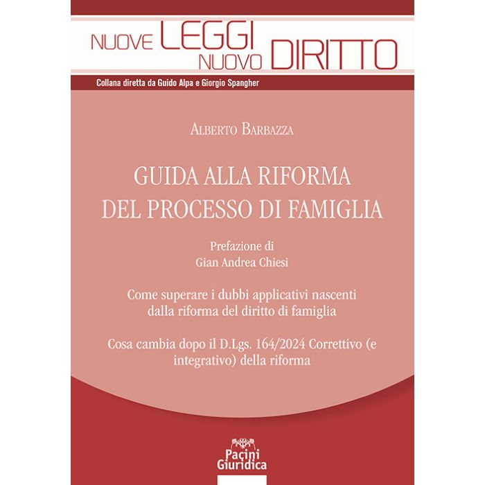 La riforma introdotta con il D.Lgs. n. 149 del 10 ottobre 2022 e modificata con integrazioni dal D.Lgs. 164/2024 segna una trasformazione epocale per il diritto processuale civile e, in particolare, per il diritto delle persone, dei minori e delle famiglie. La vastità dei mutamenti impone la ricerca di una bussola per muoversi nel perimetro geografico segnato dalla riforma: l'Opera cerca proprio di rappresentare questo tipo di "Guida". Offre una dinamica nuova di lettura e studio, fondata su una parte espositiva e una didattica tramite risposte precise e concrete ai dubbi applicativi posti dagli interpreti nell'applicazione quotidiana delle nuove disposizioni, mediante l'uso di tavole sinottiche e schemi, approfondendo ogni aspetto della riforma, norma per norma e con un approccio "per materia": per ogni istituto è possibile ricostruire tutte le modifiche sostanziali e processuali. Analizza tutte le novità del processo di famiglia seguendo per maggiore comodità l'ordine del codice, approfondendo ogni aspetto del nuovo "procedimento in materia di persone, minorenni e famiglie", guardando sulle novità che in questa materia sono state apportate al codice civile, alle disposizioni di attuazione del c.c. e del c.p.c. ed alle leggi speciali. Vengono proposte spiegazioni piuttosto che critiche; schemi concreti e tabelle, piuttosto che riflessioni teoriche; un modo di ragionare concreto, un primo commento pratico alla riforma che possa rappresentare un immediato ausilio a tutti gli operatori del settore e non solo. Prefazione di Gian Andrea Chiesi.