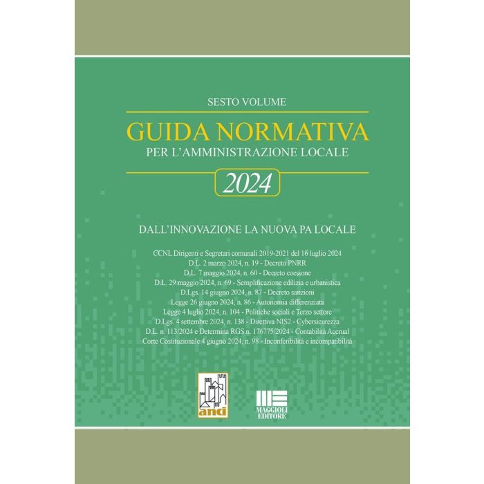 L'opera illustra tutte le innovazioni intervenute nel periodo gennaio 2024 - settembre 2024 che concernono gli aspetti essenziali dell'organizzazione della Pubblica Amministrazione locale e delle attività e servizi che essa esercita per il Paese. In questo volume sono quindi illustrate e sistematizzate le innovazioni relative alle 67 partizioni per funzioni e materie della Guida 2024, testimoniando il forte impegno degli Autori per rendere sempre aggiornata l'Opera. Per consentire il coordinamento dell'Aggiornamento con la Guida Normativa 2024, gli argomenti sono classificati con il riferimento alla medesima parte dell'opera. All'inizio di ciascuna parte è posto l'indice degli argomenti trattati nella stessa, suddivisi per capitoli e/o paragrafi e sezioni, rendendone agevole l'immediata consultazione. L'indice alfabetico è stato predisposto per consentire l'immediata individuazione dell'argomento da esaminare.