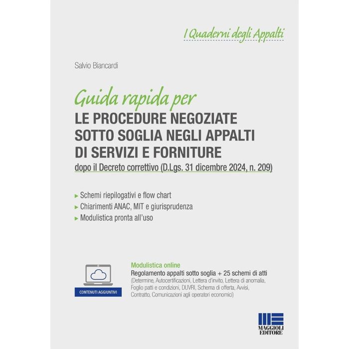 Le procedure negoziate permettono alle stazioni appaltanti di dialogare direttamente con operatori economici selezionati per definire le condizioni dell'appalto. Si può affermare che esse costituiscono lo strumento procedimentale intermedio tra gli affidamenti diretti e le procedure ordinarie. A distanza di un anno e mezzo dall'efficacia del nuovo Codice, oltre ai chiarimenti forniti dalla giurisprudenza e dalle autorità competenti, come l'ANAC e il Ministero delle Infrastrutture, il legislatore ha adottato un decreto correttivo (D.Lgs. n. 209 del 31 dicembre 2024) che ha introdotto nuove regole che incidono in modo significativo sull'iter delle procedure negoziate. Il presente quaderno si pone l'obiettivo di raccogliere e illustrare le nuove disposizioni, le pronunce e i chiarimenti sul tema, fornendo precise indicazioni ai RUP, al fine di garantire il rispetto di tutta la normativa dettata in materia. A tal fine, il volume è corredato da parti descrittive, flow chart riepilogative delle procedure che richiamano, passo passo, i singoli atti da utilizzare, schemi di sintesi e tutta la modulistica necessaria, come Determine, Autocertificazione, Lettera d'invito, Lettera di anomalia, Foglio patti e condizioni, DUVRI, Schema di offerta, Avvisi, Contratto e Comunicazioni varie agli operatori economici, per addivenire rapidamente all'aggiudicazione della fornitura o del servizio. A completamento della modulistica, sono resi disponibili un regolamento per la disciplina degli appalti sotto soglia, la relativa deliberazione di approvazione e tutti i modelli per la costituzione dell'albo fornitori.