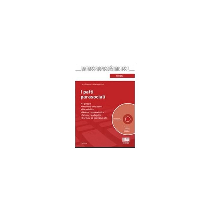 Un testo di approfondimento e commento alla disciplina dei patti parasociali, che ne esamina l'evoluzione legislativa e giurisprudenziale attraverso la c. D. Legge draghi e la successiva riforma del diritto societario, per poi trattare nel dettaglio le singole tipologie di patti (sindacati di voto, di blocco e di gestione; accordi lock up; put and call options e altri patti ritenuti validi dalla giurisprudenza) e le loro eventuali invalidità e violazioni, con relative forme di tutela. Questa seconda edizione è stata ulteriormente ampliata, grazie all'inserimento di due nuovi capitoli, dedicati alla recedibilità dei patti parasociali a tempo indeterminato e ad una disamina comparatistica dei patti. Aggiornato con i più recenti orientamenti dottrinali e giurisprudenziali, sintetizzati nelle numerose note a piè pagina, il volume è completato da un formulario contenente 12 esempi dei principali patti e schemi di atti e ricorsi in materia, riportato anche sull'allegato cd rom, per consentirne la personalizzazione e la stampa.
