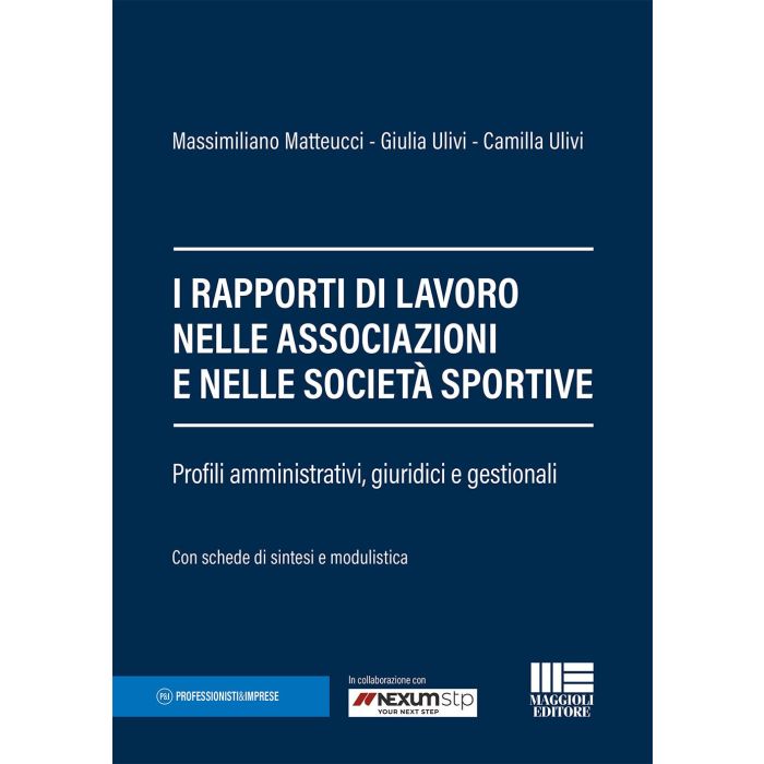 Il "lavoro sportivo" negli ultimi anni sta subendo notevoli cambiamenti finalizzati a rendere sempre più professionale l'intero settore. La "riforma dello sport", che avrebbe dovuto innovare la normativa sportiva semplificandola e rendendola più organica, ha invece posto numerose problematiche. La Sezione lavoro della Suprema Corte di Cassazione da dicembre 2021 a gennaio 2022, ha emanato 37 sentenze, stabilendo, tra l'altro, che non è possibile riconoscere i compensi sportivi (agevolati) per chi svolge l'attività sportiva con professionalità, riportando quindi la situazione ai primi anni 2000. Il testo, alla luce dei recenti orientamenti giurisprudenziali, approfondisce la tematica del lavoro in ambito sportivo delineando un quadro operativo e di sintesi utile agli operatori di settore. Il volume, oltre a dare una panoramica dell'attuale normativa, approfondisce adempimenti e peculiarità della gestione del lavoratore sportivo professionista, dilettante e del collaboratore amministrativo. Un capitolo è dedicato agli adempimenti previdenziali, assicurativi e fiscali. L'opera è arricchita da schede di sintesi e modulistica per la gestione completa dei lavoratori in ambito sportivo. Massimiliano Matteucci Consulente del Lavoro in Roma, Milano e Bologna, Socio Nexumstp Spa. Cultore della materia presso la cattedra di Diritto del Lavoro dell'Università "La Sapienza" di Roma e presso l'Università "Niccolò Cusano" di Roma. Docente a contratto per Master Universitari di I e II livello. Professore a contratto di "Innovazione digitale e relazioni industriali" presso l'Università "Niccolò Cusano" di Roma. Giulia Ulivi Consulente del Lavoro in Firenze. Fondatrice del gruppo Professionisti-Per le "Pubbliche Amministrazioni". Collabora stabilmente con il Tribunale di Firenze come Consulente Tecnico per la risoluzione di contenziosi giuslavoristici e nell'ambito fallimentare. Camilla Ulivi Commercialista in Firenze. Collabora con il Tribunale di Firenze come Curatore Fallimentare. Si occupa prevalentemente di consulenza ed assistenza ad imprese e persone fisiche. Specializzata nella gestione di lavoratori autonomi e dipendenti dello Sport nonché nella gestione degli Enti del Terzo Settore.
