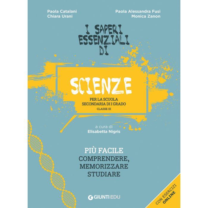 La collana I saperi essenziali nasce per aiutare gli studenti a individuare e riconoscere i concetti e gli argomenti essenziali da studiare, organizzare i contenuti per ripassare senza dimenticare le cose più importanti e prepararsi alle verifiche e all'esame finale. Struttura e caratteristiche chiave: Il volume contiene gli argomenti essenziali affrontati nella classe III della scuola secondaria di I grado: l'energia e la materia, dall'Universo al pianeta Terra, la storia degli organismi viventi, la reazione agli stimoli esterni e la riproduzione, con un approccio coinvolgente che aiuta lo studente a scoprire e capire la vita in tutte le sue forme e lo esorta a tutelare il nostro pianeta. Nello specifico gli argomenti che il volume tratta sono: Energia, Forme dell'energia, Trasformazioni e degradazione dell'energia Dall'universo al pianeta Terra Dal big bang ai buchi neri Il sistema solare La struttura interna della Terra La tettonica a placche (vulcani, terremoti, ciclo delle rocce) Il tempo geologico e i fossili L'antropocene e i cambiamenti climatici Storia degli organismi viventi L'evoluzione La genetica Il DNA Il corpo umano La gestione dell'informazione La riproduzione Completa la pubblicazione un'espansione online, richiamabile con QR code, con: esercizi di autoverifica per mettersi alla prova, soluzioni degli schemi da completare, versione digitale degli schemi per il ripasso, da stampare e avere sempre con sé. Il libro è organizzato in Unità e Capitoli: All'avvio di ciascuna Unità trovi un indice dei saperi essenziali trattati all'interno dei vari Capitoli che può essere funzionale a individuare velocemente i nuclei che vuoi ripassare senza dover sfogliare l'intera Unità. In ciascuna pagina dell'Unità a fianco del testo trovi un'area "Focus" con domande, che ti aiutano a concentrarti sul contenuto principale o su alcuni "passaggi" fondamentali, e schemi, che sistematizzano i nodi salienti di un paragrafo, ricorrendo a parole chiave. Alla fine di ogni Unità trovi degli schemi per il ripasso degli argomenti trattati, che puoi usare come rinforzo al termine di ogni Capitolo. Ti suggeriamo di ripetere a un'altra persona (amico, familiare...), ma, se ti dovessi trovare da solo, puoi registrarti e poi riascoltarti. Per mettersi alla prova e completare il ripasso, tramite QR code si può accedere agli esercizi online per simulare un'interrogazione o una verifica. Utile per aiutare i ragazzi a: individuare e riconoscere i concetti e gli argomenti essenziali da studiare; organizzare i contenuti per ripassare senza dimenticare le cose più importanti; prepararti alle verifiche e all'esame finale.
