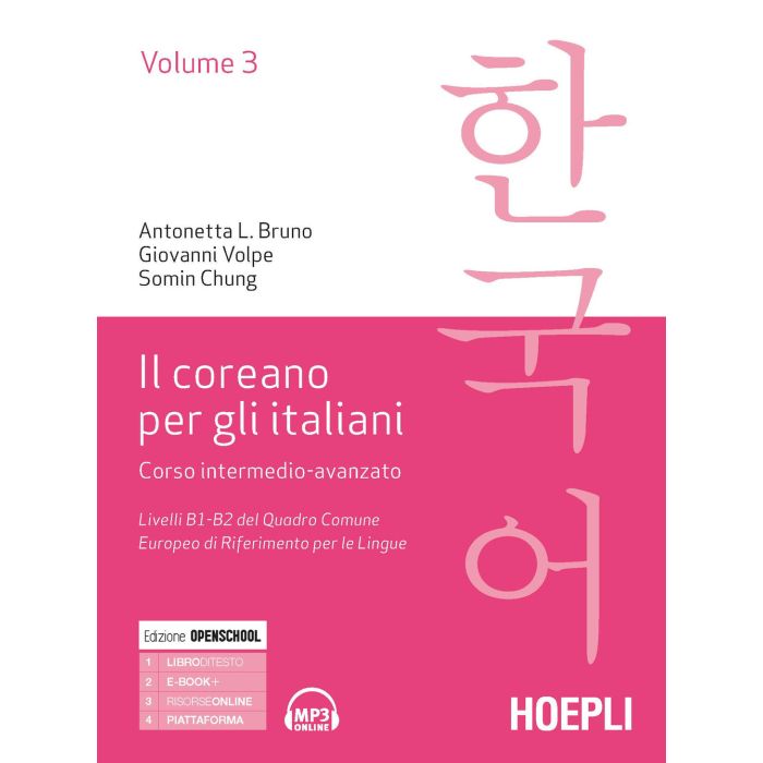 Il coreano per gli italiani è un corso in tre volumi che sviluppa in modo mirato ed efficace le competenze comunicative (linguistiche, sociolinguistiche e pragmatiche) dei primi 4 livelli dell'esame TOPIK (Test of Proficiency in Korean), corrispondenti ai livelli A1-B2 del Quadro Comune Europeo di Riferimento per le Lingue. Il volume 3, di livello intermedio-avanzato (livelli terzo e quarto del TOPIK e B1-B2 del QCER), si articola in 24 unità dedicate a temi specifici e incentrate su diversi compiti comunicativi. Ogni unità si apre con uno o più testi basati su situazioni e contesti concreti: in questo terzo volume i testi sono solo in coreano, lasciando allo studente il compito di tradurli; seguono una rubrica lessicale e la spiegazione delle nuove regole grammaticali. Tutte le unità sono accompagnate da diversi esercizi (lettura, lessico, grammatica, ascolto, conversazione e scrittura) per consolidare gradualmente le abilità comunicative. A fine testo sono proposti ulteriori esercizi specifici per la preparazione all'esame TOPIK e un glossario del lessico incontrato nel manuale.