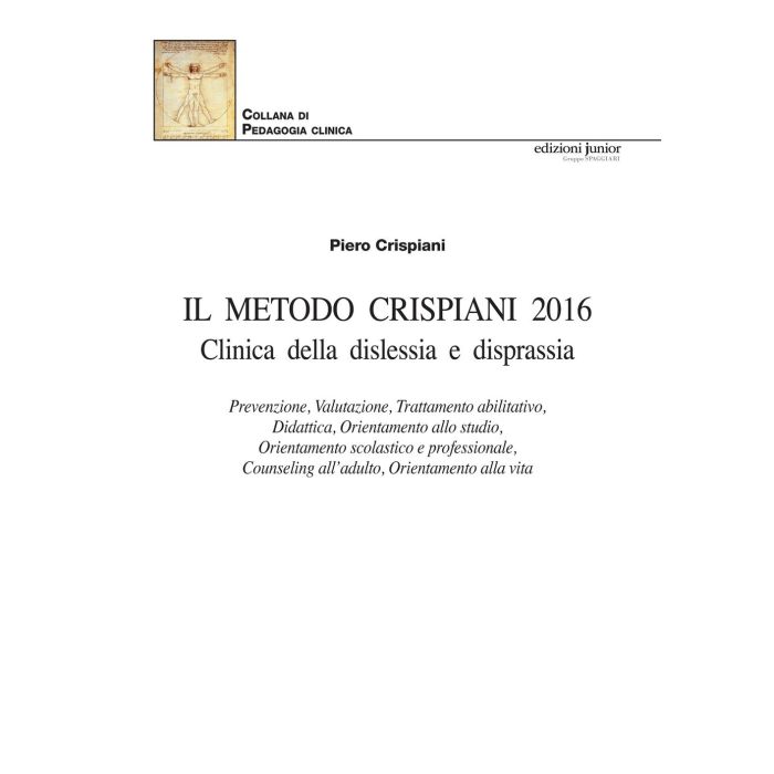 Il trentennale lavoro su dislessia e disprassia, già espresso in saggi (Dislessia come disprassia sequenziale, Dentro la dislessia, La sindrome di Jack) e nei Materiali professionali (Kit "Le Azioni"), tutti pubblicati da Edizioni Junior, giunge a completa esposizione delle Pratiche Ecologico-Dinamiche, componendo qui organicamente il Metodo Crispiani, declinato in ogni suo significato: le Definizioni, il Quadro concettuale, le Linee eziologiche, le Linee per la Diagnosi e la Valutazione funzionale, la Prevenzione, il Quadro sindromico e le Mappe semiotiche, il Trattamento abilitativo, le Indicazioni scolastiche e didattiche, le Avvertenze per la famiglia, il Monitoraggio ecc. Il Metodo Crispiani correda il Materiale professionale, le procedure e le esperienze ponendosi come Linee-Guida per lo studio del fenomeno Dislessico-Disprassico (D&D) e per l'agire professionale di Diagnostici, Terapisti, Docenti e per Genitori. Il lavoro si compendia quindi di Allegati (materiali diagnostici), Lista di parole-chiave, Lista di sigle ed acronimi, Bibliografia tematica.