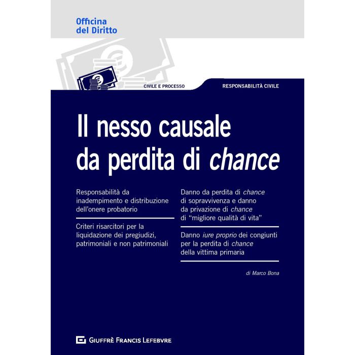 Officina del diritto: è uno strumento di lavoro e di studio pensato per arricchire le proprie conoscenze giuridiche attraverso un sistema di lettura strutturato su più livelli: uno più immediato che consente di focalizzare i concetti "guida" di una precisa fattispecie giuridica con l'utilizzo di esempi, tavole sinottiche, schemi, formule, quesiti, mappe giurisprudenziali, e un altro più approfondito che illustra organicamente la materia e nel quale si rinvengono informazioni puntuali e chiarimenti mirati di pronta fruibilità. L'opera "Il nesso causale da perdita di chance" affronta i seguenti temi: Responsabilità da inadempimento e distribuzione dell'onere probatorio - Criteri risarcitori per la liquidazione dei pregiudizi, patrimoniali e non patrimoniali - Danno da perdita di chance di sopravvivenza e danno da privazione di chance di "migliore qualità di vita" - Danno iure proprio de congiunti per la perdita di chance della vittima primaria.