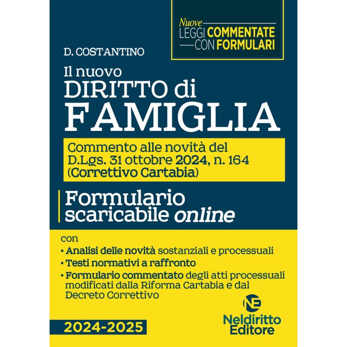 A due anni dalla Riforma Cartabia (D.Lgs. 10 ottobre 2022, n. 149), il Decreto Correttivo del 2024ha profondamente modificato il sistema sostanziale e processuale. Il volume Il nuovo diritto di famiglia, Neldiritto Editore, rivolto a avvocati, magistrati, studiosi, contiene un'analisi puntuale e ragionata delle novità apportate dal Decreto Correttivo Cartabia, oltre che dalla Riforma del 2022. Il Volume, suddiviso in tre Parti, consente di disporre di: un'articolata ricostruzione(contesti normativi a raffronto) di tutte le novità sostanziali introdotte; una ricca disamina (contesti normativi a raffronto) delle tantissime innovazioni processuali; una rassegna(scaricabile anche online) dei principali atti processuali destinati a subire inevitabili modifiche in conseguenza della Riforma Cartabia e del Correttivo del 2024, ciascuno seguito da un inquadramento sistematico.