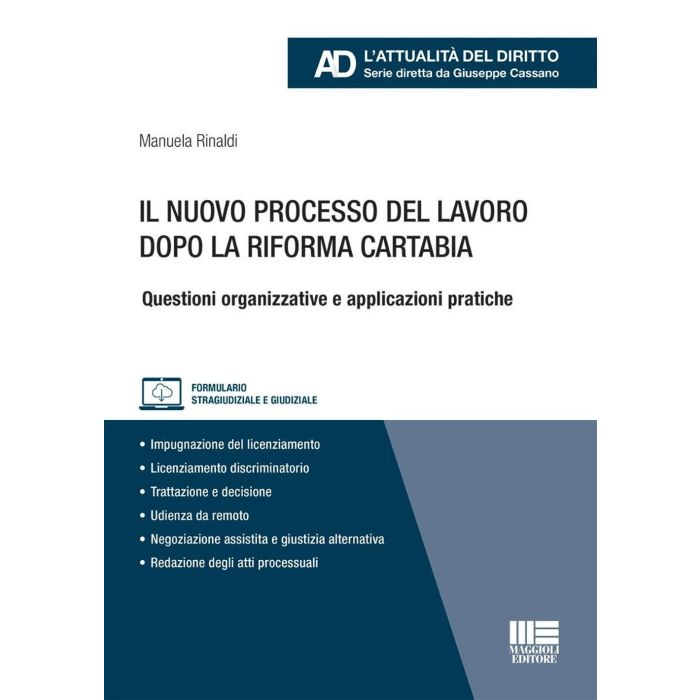 Nel presente volume vengono affrontate, con un'esposizione chiara e semplice, le tematiche del diritto del lavoro, sostanziale e procedurale, sorte con le prime applicazioni pratiche delle novità introdotte dalla Riforma Cartabia (d.lgs. n. 149/2022).Tra le tematiche che avranno un maggiore impatto "immediato" nelle controversie di lavoro, vi è l'introduzione della negoziazione assistita, che non si pone, però, come condizione di procedibilità della domanda giudiziale, bensì quale mera facoltà attribuita alle parti, nonché la definitiva (attesa?) abrogazione del c.d. rito Fornero in materia di impugnativa giudiziaria dei provvedimenti di licenziamento. Il testo ripercorre tutte le novità più recenti, tra cui la sentenza della Corte costituzionale 7/2024, che si è pronunciata sulla disciplina dei licenziamenti collettivi prevista dal Jobs Act, ed affronta criticità e prospettive a distanza di circa un anno dalla Riforma, avvalendosi dell'ausilio di tabelle riepilogative per una migliore e più facile comprensione degli argomenti trattati e della più recente giurisprudenza. Completa il volume un pratico Formulario online stragiudiziale e giudiziale, disponibile anche in formato editabile e stampabile.