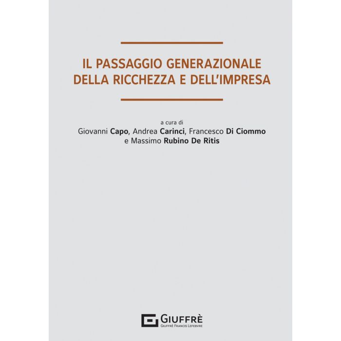 Il passaggio della ricchezza e del patrimonio è un tema molto rilevante per le società, per le imprese e per le famiglie, in particolare in Italia, il cui tessuto economico è costituito, in una rilevante percentuale, da imprese di piccola dimensione e da aziende a carattere familiare. Il passaggio generazionale deve essere affrontato sotto il profilo societario e patrimoniale, ma anche dal punto di vista strategico e organizzativo, senza dimenticare un'attenzione particolare alle dinamiche familiari e ai profili fiscali e tributari. Questo volume esamina gli strumenti che l'ordinamento giuridico offre a chi intende pianificare un ricambio generazionale, con particolare attenzione all'intestazione fiduciaria delle partecipazioni sociali, al conferimento d'azienda, alle vicende successorie conseguenti alla morte del socio e alla trasmissione delle posizioni di governo delle società, alle holding di famiglia e alle operazioni straordinarie. È inoltre analizzato il tema della pianificazione patrimoniale e quello degli accordi di famiglia. L'intera opera, caratterizzata da un taglio pratico e operativo, integra le opinioni della più rilevante dottrina ed è aggiornato con gli orientamenti giurisprudenziali più rilevanti, costituendo uno strumento indispensabile per tutti i soggetti coinvolti in questa complessa operazione.