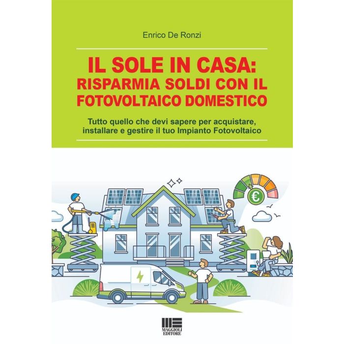 1. Il Sole: energia infinita Come è generata la luce che giunge fino a noi e perché è considerata infinita, il filtro della Terra, stagioni, posizione Sole-Terra. 2. Cenni storici sul fotovoltaico Tecnologia non nuova, ma consolidata, cenni storici 3. Cos’è e come funziona un modulo fotovoltaico Principi di funzionamento di un modulo fotovoltaico, come è fatto un modulo fotovoltaico, perché produce, schede tecniche moduli fotovoltaici, impianti fotovoltaici “grid connected” e in “isola”, come opera un fotovoltaico, sia connesso che in isola. 3.1 Il principio di funzionamento 3.2 Componenti di un impianto fotovoltaico 3.3 La cella fotovoltaica: il cuore del pannello 3.3.1 Tipo N o tipo P? 3.3.2 Cos’è la mezza cella? 3.3.3 Moduli bifacciali 3.3.4 Altre tecnologie 3.4 Caratteristiche del pannello fotovoltaico 3.5 Introduzione agli impianti fotovoltaici 4. Gli impianti fotovoltaici grid connected Inverter, meter, CT, TA, pannelli, importanza del wi-fi, strutture di sostegno, vasca: sì o no, linea vita, altri componenti (quadri, organi di manovra, scaricatori di sovratensione, magnetotermici-differenziali, ecc.) 4.1 Perchè grid connected? 4.2 Componenti di un impianto fotovoltaico grid connected 4.3 Come si abbina un accumulo all’inverter 5. Cos’è l’accumulo elettrico e come funziona Tipi di batterie in commercio, quale scegliere e perché, funzionamento dei vari tipi di batterie di accumulo per fotovoltaico, durata di una batteria nell’uso quotidiano, cicli di vita auspicabili di una batteria, compatibilità con gli inverter, ecc 5.1 Brevi cenni storici 5.2 Tipi di accumulo 6. Che impianto serve alla mia casa? L’importanza del sopralluogo e suo svolgimento, stringhe fotovoltaiche, quante e perché, dimensionamento impianto di massima. Uso di ottimizzatori. Esempi pratici di dimensionamento di massima di fotovoltaico ed accumulo alla portata di un utente finale. Uso di software gratuito, potente, ma alla portata di ogni utente, come Google Earth Pro, ed uso di altri strumenti, semplici e gratuiti online, per il calcolo della produzione o il calcolo delle ombre (PVGIS). Abbinamento ad altri impianti come le pompe di calore per riscaldamento, raffrescamento o per acqua calda sanitaria (ACS), Wallbox per ricarica auto elettriche che colloquia con l’inverter. 6.1 Verifica dei vincoli 6.2 Sopralluogo tecnico 6.3 Stringhe e ombreggiamenti 6.4 Dimensionamento dell’impianto 6.4.1 Introduzione e concetti fondamentali 6.4.2 Calcoli generali sulle fasce orarie 6.4.3 Solo fotovoltaico 6.4.4 Fotovoltaico con accumulo 6.4.5 Accumulo dopo un anno di fotovoltaico 6.5 PV GIS: uno strumento alla portata di tutti 6.6 Google Earth pro 6.7 Abbinamento del fotovoltaico ad altri impianti 6.8 Wallbox per auto elettriche 7. Funzione anti blackout e carichi critici Cos’è l’anti blackout? Come funziona? A chi serve? Cosa è un carico critico? L’anti blackout è una funzione dell’inverter o è qualcosa di più complesso? Ne vale la pena? Esempi pratici, rischi ed insidie di questa tecnologia. 8. Consigli sui consumi, l’utilizzo del fotovoltaico e calcolo del risparmio Abitudini di consumo e ritorno dell’investimento, con e senza accumulo, calcolo del risparmio annuale. Cosa è l’SSP. Caso pratico realistico. 8.1 Consigli generali 8.2 Calcolo del risparmio 9. Aspetti notevoli prima dell’acquisto Incentivi, cosa è il RID, garanzie (tipologia delle varie garanzie per i differenti componenti), polizze di assicurazione, clausole contrattuali (cause di guasto o danneggiamento da agenti atmosferici); cenni sulla burocrazia per dare un’idea delle pratiche necessarie, dalla paesaggistica, alle pratiche col gestore elettrico: iter semplificato o ordinario e quando, allaccio o attivazione, pratica con Terna (cos’è Gaudì) e GSE. 9.1 Incentivi 9.2 Garanzie 9.3 Polizze assicurative 9.4 Burocrazia e pratiche 10. Gruppi di autoconsumo collettivo e condomini E se non puoi fare il TUO fotovoltaico, perché vivi in un condominio? NUOVE soluzioni vantaggiose, cos’è un gruppo di autoconsumo, come funziona, quando farlo. 11. Manutenzione dell’impianto fotovoltaico e documentazione fine impianto In che consiste la manutenzione di un impianto fotovoltaico? Si deve fare? Documentazione da conservare e perché è utile nel futuro del vostro impianto. 11.1 Manutenzione 11.2 Documentazione finale 12. Problemi comuni e soluzioni, uso dell’app come strumento di diagnostica veloce Utilità dell’app non solo per monitorare i consumi, trucchi e pericoli di un utilizzo approfondito tramite i “privilegi account installatore”, esempio di problematiche comuni verificabili anche come utente finale sul proprio impianto con le soluzioni più probabili, settaggi errati visibili dalla produzione, installazione errata verificabile a colpo d’occhio. 13. Come comportarsi con l’assistenza in caso di guasto: consigli utili 14. Aumento delle prestazioni nel tempo: repowering (ampliamento) o revamping (aggiornamento) Differenze tra i due, quando applicarli, onerosità in relazione al valore dell’impianto, come si attuano, possibilità e pericoli di non compatibilità, attenzione alle batterie (non sempre è possibile aumentarne il numero e perchè)! 15. Impianto fotovoltaico in isola o off-grid Impianti per baite in montagna, barche, luoghi dove non arriva l’energia elettrica, componenti principali, dimensionamento di massima. 16. Fotovoltaico “alternativo” Varie tecnologie: dal fotovoltaico da balcone, a quelle diverse dal classico pannello, come i pannelli “tegola”, pannelli che si arrotolano, altre forme di silicio, come l’amorfo. 17. Futuro del fotovoltaico: pannelli stampati in 3D, idrogeno ed altro Tecnologie innovative che potrebbero essere disponibili tra pochi anni. 18. Altre energie rinnovabili Solare termico, Eolico: mini e micro, Energia dalle maree, Idroelettrico, Accumuli gravitazionali. Conclusioni |