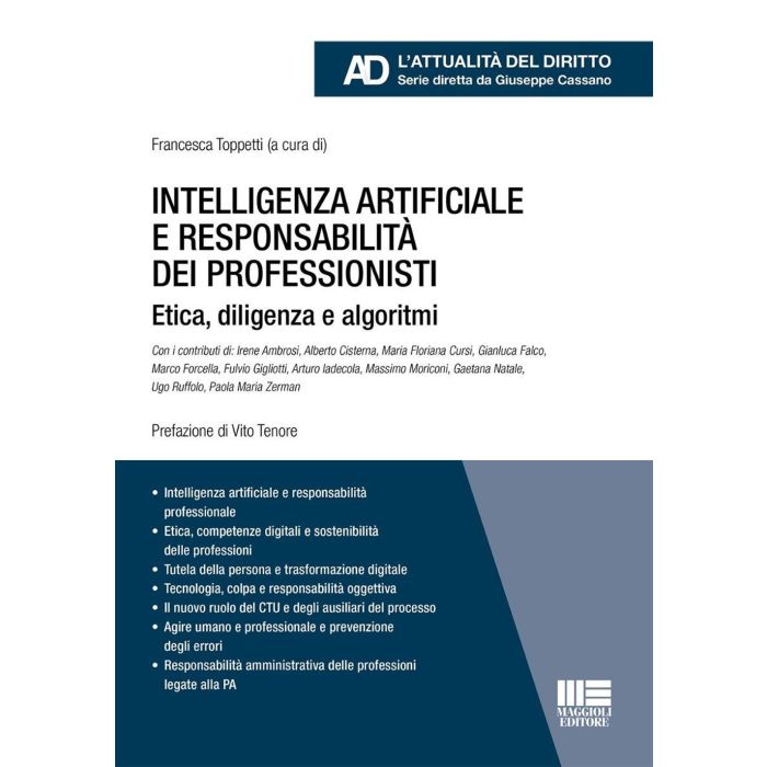 Capitolo IX – La responsabilità professionale del notaio, di Marco Forcella Introduzione 1. La responsabilità disciplinare 2. La responsabilità civile 3. La responsabilità penale 4. La responsabilità fiscale e contributiva Conclusione Capitolo X – Il futuro delle competenze nell’era dell’intelligenza artificiale, di Gaetana Natale Introduzione 1. Le applicazioni dell’intelligenza artificiale in ambito sanitario e biomedicale 2. Gli ostacoli alla piena integrazione dell’AI nel sistema sanitario 3. Rischi etici e nuove conoscenze 4. La responsabilità medica tra AI Act e prospettive di riforma nazionali Capitolo XI – Integrità della condotta ed esclusione della responsabilità professionale, di Paola Maria Zerman 1. Dalla patologia alla prevenzione comportamentale della condotta causativa del danno 2. I parametri del comportamento eticamente corretto 2.1. La competenza professionale 2.2. Il rispetto per la persona 2.3. La giusta retribuzione 3. Virtù o skill? 4. Conclusione Capitolo XII – La responsabilità amministrativo-contabile del professionista, di Arturo Iadecola 1. Premessa 2. La responsabilità amministrativo-contabile 2.1. Profili sostanziali 2.2. Profili processuali 3. I professionisti e la giurisdizione della Corte dei conti: casistica esemplificativa 3.1. Avvocati 3.2. Architetti e ingegneri 3.3. Medici e farmacisti 3.4. Notai 3.5. Ausiliari del giudice. Procedure concorsuali 3.6. Organi degli Ordini professionali 3.7. Consulenti di soggetti privati Postfazione Gli Autori