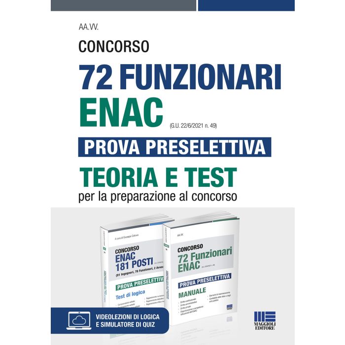 ds- il volume "Concorso ENAC 181 posti - Prova preselettiva - Test di logica" di Giuseppe Cotruvo ed. 2021; - il manuale "Concorso ENAC 72 Funzionari - Prova preselettiva", ed. 2021. Il testo "Concorso ENAC 181 posti - Prova preselettiva - Test di logica" di Giuseppe Cotruvo illustra le varie tipologie di quesiti a risposta multipla di carattere psicoattitudinale e di logica: numeri romani; esercizi di aritmetica; problemi di aritmetica; comprensione delle tabelle; calcolo delle combinazioni; calcolo delle probabilità; esercizi di algebra; problemi di algebra; quiz di logica matematica; serie numeriche; serie alfanumeriche e alfabetiche; ragionamento verbale (o critico-verbale o logico-verbale); ragionamento logico-deduttivo; relazioni insiemistiche; ragionamento logico-figurale e attenzione ai particolari. Per ciascuna delle numerose tipologie di test si offre un nutrito numero di esempi e 4 simulazioni di test alle quali sono collegate 150 videolezioni di Giuseppe Cotruvo che chiariscono il procedimento logico per individuare l'alternativa esatta, forniscono consigli e spiegano le tecniche di risoluzione. Il Manuale "Concorso ENAC 72 Funzionari - Prova preselettiva" offre la trattazione teorica delle materie di carattere giuridico-economico: Diritto costituzionale, Diritto amministrativo, Diritto privato, Organizzazione e competenze istituzionali dell'ENAC, Elementi di macroeconomia, Contabilità dello stato e degli enti pubblici. Disponibili nelle sezioni online dei 2 volumi contenuti nel kit i seguenti materiali: - videolezioni di logica; - simulatore di quiz; - aggiornamenti normativi.