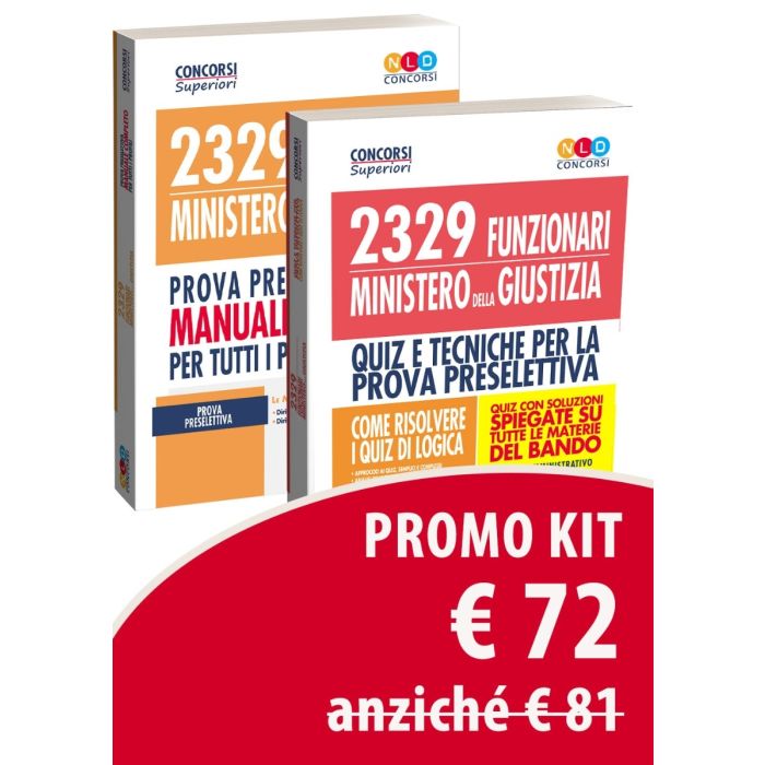 Il "kit manuale + quiz per la preparazione al Concorso per 2329 Funzionari Giudiziari ministero della giustizia" propone una ricca trattazione teorica delle materie oggetto delle prove di concorso annunciato dal Decreto Pubblicato in G.U. il 18 Aprile 2019 è inoltre utile a coloro i quali attendono il bando di concorso ed intendono cominciare ad esercitarsi sui quiz delle materie fondamentali, che potrebbero essere oggetto delle prove concorsuali.