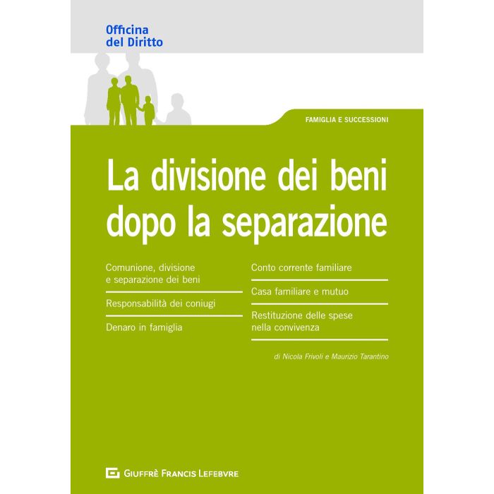 Officina del diritto: è uno strumento di lavoro e di studio pensato per arricchire le proprie conoscenze giuridiche attraverso un sistema di lettura strutturato su più livelli: uno più immediato che consente di focalizzare i concetti "guida" di una precisa fattispecie giuridica con l'utilizzo di esempi, tavole sinottiche, schemi, formule, quesiti, mappe giurisprudenziali, e un altro più approfondito che illustra organicamente la materia e nel quale si rinvengono informazioni puntuali e chiarimenti mirati di pronta fruibilità. L'opera "La divisione dei beni dopo la separazione" affronta le seguenti tematiche: -Comunione, divisione e separazione dei beni; -Responsabilità dei coniugi; -Denaro in famiglia ; -Conto corrente familiare; -Casa familiare e mutuo; -Restituzione delle spese nella convivenza.