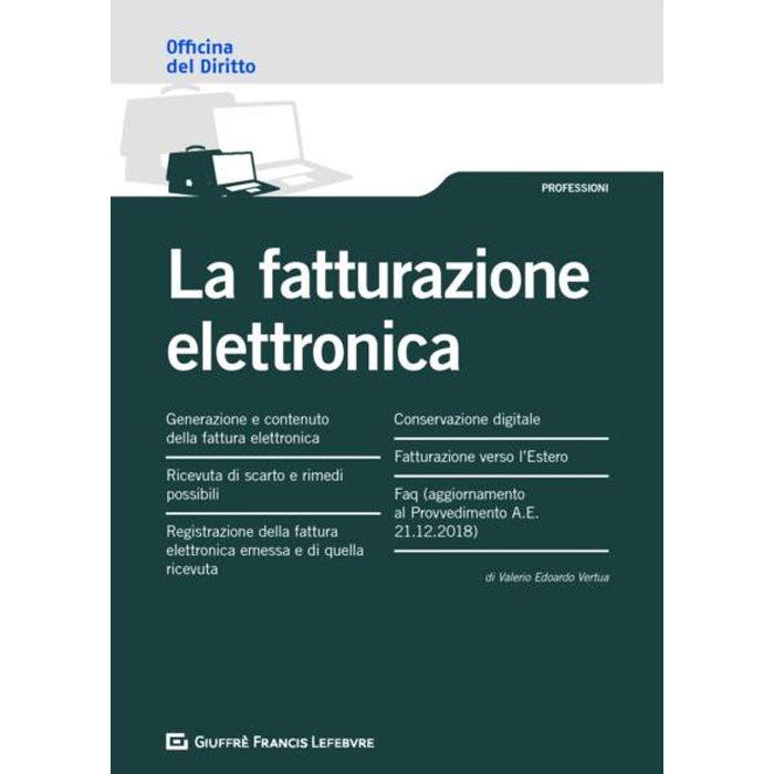 Officina del diritto: è uno strumento di lavoro e di studio pensato per arricchire le proprie conoscenze giuridiche attraverso un sistema di lettura strutturato su più livelli: uno più immediato che consente di focalizzare i concetti "guida" di una precisa fattispecie giuridica con l'utilizzo di esempi, tavole sinottiche, schemi, formule, quesiti, mappe giurisprudenziali, e un altro più approfondito che illustra organicamente la materia e nel quale si rinvengono informazioni puntuali e chiarimenti mirati di pronta fruibilità. L'opera "La fatturazione elettronica" affronta i seguenti temi: - generazione e contenuto della fattura elettronica; - ricevuta di scarto e rimedi possibili; - registrazione ella fattura elettronica emessa e di quella ricevuta; - conservazione digitale; - fatturazione verso l'Estero; - Faq (aggiornamento al Provvedimento A.E. 21.12.2018)