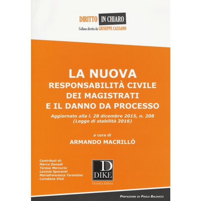 Il volume esamina le previsioni ed i limiti di applicabilità della l. 27 febbraio 2015, n. 18 la quale ha modificato la cd. "Legge Vassalli" (l, n. 117/1988) prevedendo la risarcibilità del danno ingiusto provocato da comportamenti, atti o provvedimenti giudiziari posti in essere dal magistrato con dolo o colpa grave durante l'esercizio delle funzioni ovvero nel caso di diniego di giustizia. È di seguito affrontato il tema della ragionevole durata del processo mediante la disamina della vigente disciplina della cd. "Legge Pinto" alla luce della giurisprudenza della Corte EDU ed in considerazione delle innovazioni introdotte dalla l. 28 dicembre 2015, n. 208 (Legge di stabilità 2016) la quale ha ridimensionato la quantificazione dell'indennizzo introducendo il cd. "rimedio preventivo", ossia la dimostrazione di avere fattivamente intrapreso le vie più brevi per ottenere il provvedimento giurisdizionale. A completamento del quadro dei rimedi al danno da processo, sono affrontati gli istituti processualpenalistici della riparazione per l'ingiusta detenzione e dell'errore giudiziario la cui trattazione, al pari degli altri argomenti, è arricchita da riferimenti alla dottrina ed alla più recente giurisprudenza di legittimità, di merito e sovranazionale.