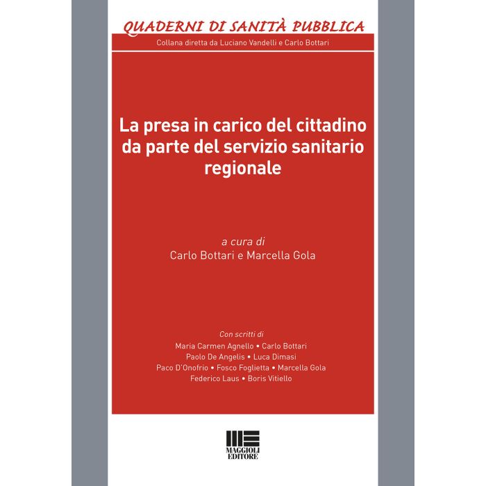 Introduzione: La “presa in carico” del cittadino da parte del SSR di Fosco Foglietta Capitolo 1 – La presa in carico del paziente nelle Regioni del meridione di Maria Carmen Agnello 1. I profili generali della presa in carico: le prestazioni socio sanitarie e la spesa sanitaria 1.1. Il contesto sociale e sanitario: il target assistenziale e le criticità della presa in carico tra nord e sud 1.2. L’evoluzione normativa: l’impatto del federalismo sanitario nell’erogazione di servizi sanitari 2. L’evoluzione organizzativa da una medicina di attesa ad una medicina di iniziativa: prospettive e strategie 2.1. I percorsi verso modelli di protezione sociale integrata 3. Gli strumenti programmatori e le misure attuative: il Piano nazionale della cronicità e i Piani attuativi regionali 3.1. I percorsi attuativi: i Piani sanitari e le misure regionali 3.2. Gli strumenti di Community care: verso una medicina di prossimità 4. I modelli organizzativi virtuosi: sistemi regionali a confronto 4.1. I modelli regionali virtuosi: Emilia-Romagna e Lombardia 4.2. Le best practices delle Regioni meridionali 5. Conclusioni: come gestire il cambiamento Riferimenti bibliografici Capitolo 2 – Le Case della salute nell’organizzazione emiliano-romagnola di Paolo De Angelis 1. Premessa 2. La realtà emiliano-romagnola 3. Conclusioni 4. Alcuni dati statistici Capitolo 3 – La presa in carico nel sistema sanitario lombardo di Federico Laus 1. La presa in carico: premessa 2. La legge regionale n. 33/2009, così come modificata dalla legge regionale n. 23/2015 3. Osservazioni sull’attuazione della presa in carico Capitolo 4 – Il sistema sanitario della Regione Veneto di Luca Dimasi 1. La sanità regionalizzata 1.1. Segue: i modelli di governance regionali 2. Il sistema sanitario veneto: un’analisi ragionata 2.1. Segue: l’Azienda Zero 3. Per concludere Capitolo 5 – La presa in carico nei trattamenti di fine vita: la l.r. Marche n. 7/2019 di Paco D’Onofrio 1. La legge regionale n. 7/2019 2. La rete regionale per le cure palliative Capitolo 6 – I professionisti sanitari nella presa in carico del paziente di Boris Vitiello 1. La presa in carico come regola immanente al sistema sanitario 2. Il diritto al consenso informato del paziente e il momento della presa in carico 3. La presa in carico tra nozione di “contatto sociale” e responsabilità degli esercenti le professioni sanitarie Conclusioni di Carlo Bottari Notizie sugli Autori