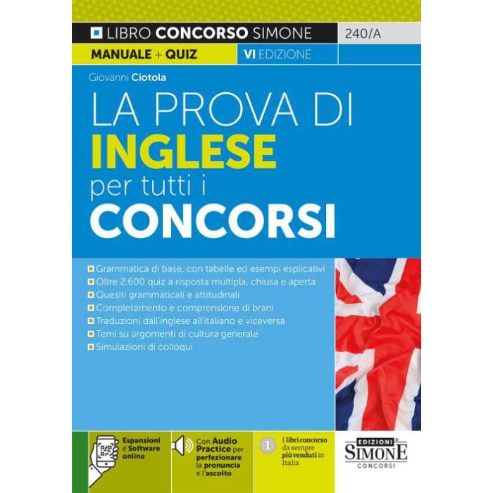 Proprio in virtù di questa considerazione, abbiamo pubblicato il presente manuale, La prova di Inglese per tutti i concorsi (cod. 240/A), giunto alla sua sesta edizione e rivolto a quanti intendono conseguire una preparazione mirata ed efficace per sostenere qualunque tipo di prova concorsuale incentrata sulla lingua d’Oltremanica.