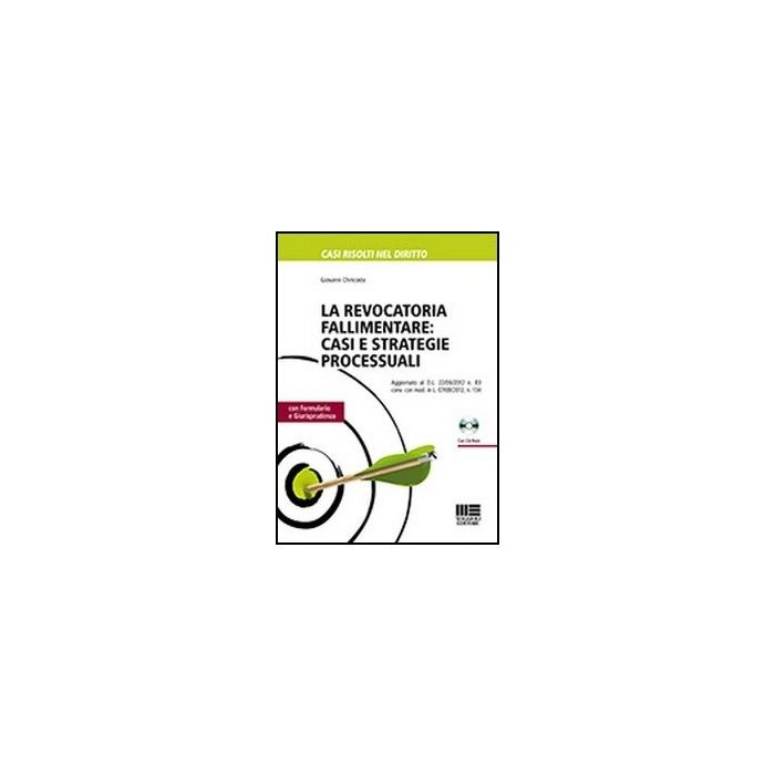L'opera, con formulario e giurisprudenza, è aggiornata alle ultime novità introdotte dal cosiddetto secondo decreto sviluppo (d. L. 22 giugno 2012 n. 83 convertito con modifiche in l. 7 agosto 2012 n. 134). La revocatoria fallimentare costituisce lo strumento del curatore per ricostruire il patrimonio del fallito e garantire così la par condicio creditorum. Il presente volume vuole essere un supporto operativo per chi, curatore fallimentare o avvocato oppure altro professionista coinvolto, ha l'esigenza di dover garantire le ragioni dei creditori. Strutturato con taglio essenzialmente pratico, e arricchito da numerosi riferimenti giurisprudenziali e dottrinali, il libro è suddiviso in una parte generale dedicata alla revocatoria fallimentare e alla relativa procedura ed in una parte speciale incentrata, invece, sulle singole ipotesi di revocatoria e sui casi particolari. Completano la trattazione un pratico formulario per la prassi giudiziale nonchè un'esaustiva rassegna di giurisprudenza. Il cd-rom allegato contiene le sentenze in formato integrale e le formule compilabili e stampabili.