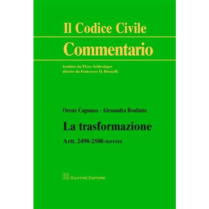 La seconda edizione del volume, arricchita dai naturali svolgimenti dottrinali e giurisprudenziali, offre un commento completo e puntuale agli artt. 2498-2500-novies. Le disposizioni sulle trasformazioni inizialmente riferite alla sola trasformazione della società e contenute in tre articoli del codice civile (2498-2500), risultano adesso ampliate e abbracciano, dopo la riforma, undici articoli (art. 2498-2500-novies). L'opera intende, pertanto, evidenziare le novità giurisprudenziali e dottrinarie più rilevanti relative al tema della "trasformazione". La riforma del diritto societario ha effettuato, infatti, importanti interventi in tema di operazioni straordinarie fra soggetti "eterogenei": in particolare le novità riguardano la semplificazione delle procedure e la disciplina delle cosiddette "trasformazioni eterogenee", intese come "passaggio" dalla forma societaria (di capitali) ad altra forma (consorzi, associazioni, ecc.) o viceversa.