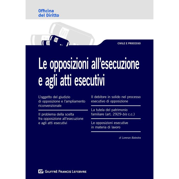 L'opera "Le opposizioni all'esecuzione e agli atti esecutivi" affronta i seguenti temi: l'oggetto del giudizio di opposizione e l'ampliamento riconvenzionale; il problema della scelta fra opposizione all'esecuzione e agli atti esecutivi; il debitore in solido nel processo esecutivo di opposizione; la tutela del patrimonio familiare (art. 2929-bis c.c.); le opposizioni esecutive in materia di lavoro. La collana Officina del diritto è pensata per arricchire le proprie conoscenze giuridiche attraverso un sistema di lettura strutturato su più livelli: uno più immediato che consente di focalizzare i concetti "guida" con l'utilizzo di esempi, tavole sinottiche, schemi, formule, quesiti, mappe giurisprudenziali, e un altro più approfondito che illustra organicamente la materia con informazioni puntuali e chiarimenti mirati di pronta fruibilità.