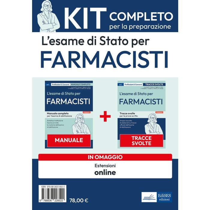 Il kit è composto da due volumi: il Manuale di preparazione per l'Esame di Stato per Farmacisti; le tracce svolte e prove pratiche per l'esame di Stato per Farmacisti. Completano il pacchetto di volumi estensioni online: - raccolta di Prove ufficiali degli anni precedenti; la nuova Tariffa dei medicinali; monografie della Farmacopea Ufficiale.