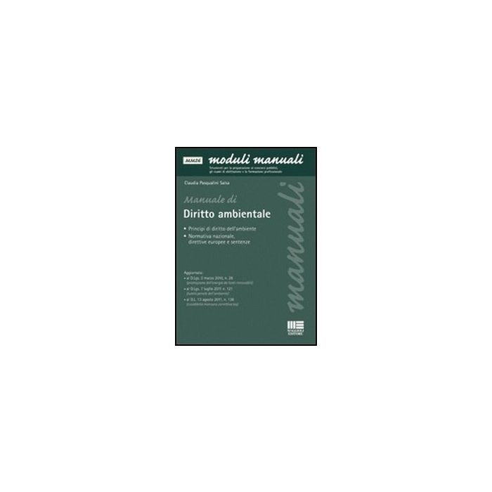 Il manuale, dopo aver passato in rassegna gli istituti fondamentali del diritto ambientale, analizza in maniera sistematica le norme che regolano le competenze delle pubbliche amministrazioni in materia di vigilanza ambientale, la gestione dei rifiuti, la tutela delle acque, l'inquinamento atmosferico e acustico, la difesa del suolo, le procedure in materia di via e di vas, le fonti energetiche, il danno ambientale. Il testo si avvale di una esposizione sintetica, attenta alle più recenti evoluzioni della normativa (italiana ed europea) e della giurisprudenza in materia ambientale. In particolare, il volume risulta aggiornato: al d. Lgs. 3 marzo 2010, n. 28 (promozione dell'energia da fonti rinnovabili); al d. Lgs. 7 luglio 2011 n. 121 (tutela penale dell'ambiente); al d. L. 13 agosto 2011, n. 138 (cosiddetta manovra correttiva bis). La completezza che caratterizza questo volume lo rende uno strumento di utile sia per quanti devono sostenere esami universitari e concorsi pubblici, sia per l'aggiornamento professionale di quanti si interessano di tematiche ambientali.