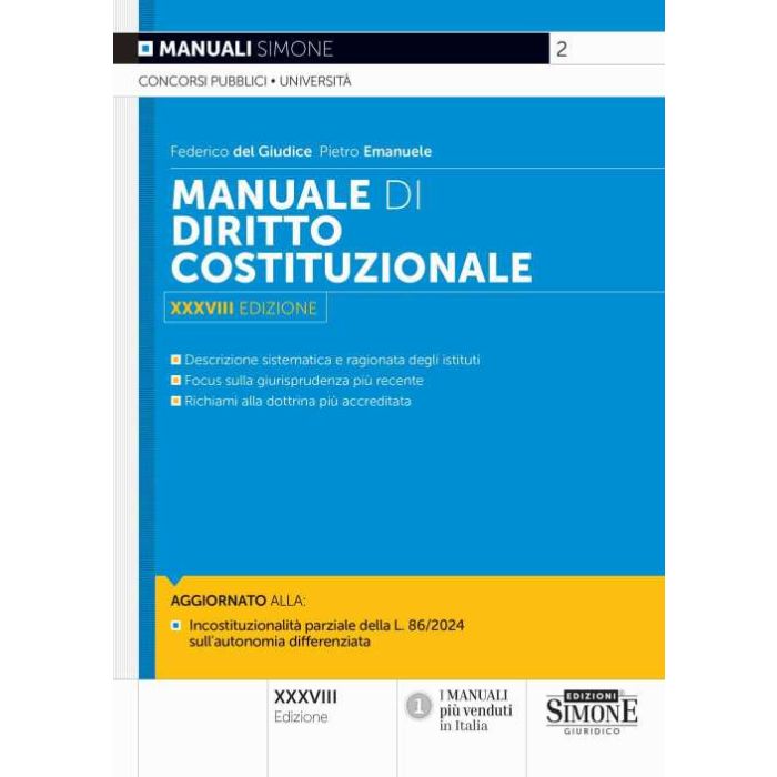 Il "Manuale di Diritto Costituzionale" 2024, giunto alla XXXVIII edizione, si caratterizza per un'esposizione chiara e completa, consentendo di acquisire una preparazione esaustiva di istituti di cui si sente sempre parlare ma di cui non si conoscono, in verità, fondamenti e contenuti. Allo scopo di consentire la migliore preparazione possibile, il nuovo Manuale di Diritto Costituzionale illustra non solo gli argomenti fondamentali, ma evidenzia anche le tematiche di maggiore importanza e attualità riportando gli orientamenti della dottrina e della giurisprudenza. Non mancano, inoltre, gli aggiornamenti ai più recenti provvedimenti legislativi che hanno interessato il diritto costituzionale. Pur esaminando in modo approfondito i concetti tradizionali della materia, il volume evidenzia la distanza tra la teoria generale e la realtà politico-giuridica effettiva. Chi studia, infatti, deve confrontare principi e valori enunciati dal Costituente con quanto concretamente si verifica nel nostro Paese, per una conoscenza consapevole e critica del diritto costituzionale. Il Manuale di Diritto Costituzionale, per le caratteristiche evidenziate, costituisce uno strumento indispensabile per chi deve preparare l'esame di avvocato, un concorso pubblico o un esame universitario.