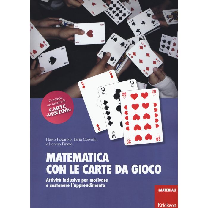 Sono ben note le potenzialità che il gioco offre per lo sviluppo, a vari livelli, delle competenze matematiche. Giocare a carte, in particolare, costituisce da generazioni un'attività utilissima per favorire negli alunni apprendimenti matematici, memoria, strategie e regole sociali. Una vera palestra in cui si impara divertendosi. Nel volume sono raccolte numerose proposte di giochi sia con le carte tradizionali che ideati dagli autori, graduati in quattro livelli in base ai processi cognitivi coinvolti o da sostenere: livello 1: giochi di supporto alla discriminazione delle carte e delle quantità; livello 2: giochi di supporto alla numerazione; livello 3: giochi di supporto al calcolo; livello 4: giochi di strategia e avvio al problem solving. I singoli giochi sono integrati da numerose varianti del tipo inclusivo (per coinvolgere efficacemente gli alunni in difficoltà), collaborativo (in cui il successo è perseguito congiuntamente da tutto il gruppo) o destinate ad accentuare le caratteristiche cognitive e strategiche. A seconda del livello di complessità del gioco scelto e quindi dei processi cognitivi coinvolti, le attività si rivolgono ai bambini della scuola dell'infanzia e agli alunni della scuola primaria e della scuola secondaria di primo grado; possono essere tuttavia svolte anche da un pubblico più adulto come ripasso matematico e, perché no, "ginnastica mentale" in un contesto ludico. Completa il libro un mazzo di 84 carte.