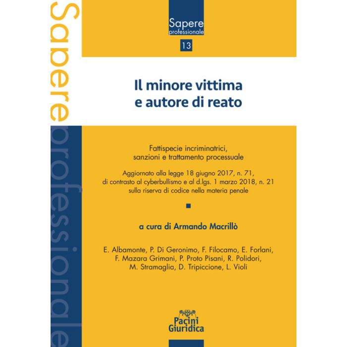 Il volume, aggiornato alla legge 18 giugno 2017, n. 71 di contrasto al cyberbullismo e al d.lgs. l marzo 2018, n. 21 sulla riserva di codice nella materia penale, annovera contributi di studiosi del settore e di magistrati specializzati ed affronta il tema della tutela penale del soggetto di età minore, sia vittima che autore di reato, esaminando le principali fattispecie incriminatrici che coinvolgono il minore nonché il cyberbullismo regolato dalla l. n. 71 del 2017 ed alle misure (anche extra-penali) atte a prevenire e contrastare il fenomeno 'de quo' in crescente espansione. Apposita sezione del volume è dedicata al minore autore di reato, al sistema sanzionatorio ed ai profili processuali fra cui spicca la tutela del minore testimone nel rito penale. Il testo comprende riferimenti alla dottrina e alla più recente giurisprudenza di merito e legittimità ed è corredato da schemi e questioni giurisprudenziali.