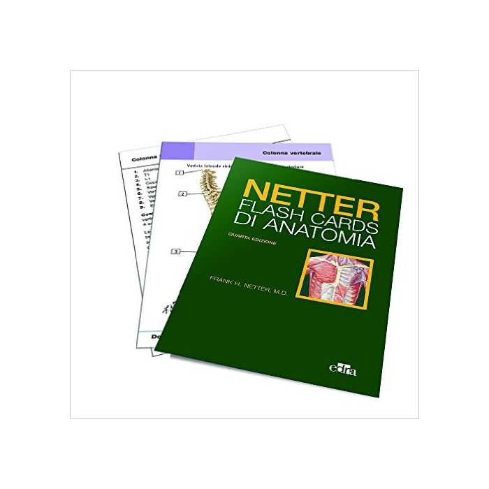 Le Netter Flash Cards di Anatomia costituiscono una risorsa di apprendimento unica in grado di integrare i libri di testo e gli atlanti di anatomia. Queste schede si avvalgono delle illustrazioni mediche, sempre attuali, di Frank H. Netter, MD, e non trattano solo il sistema muscolo-scheletrico; esse includono anche una rassegna di nervi e vasi importanti e di strutture viscerali che non trovano comunemente menzione nelle serie tradizionali di schede didattiche. Ciascuna scheda a colori descrive dettagli dell’anatomia umana come solo Netter sa fare. La serie è organizzata per regioni, seguendo lo schema dell’Atlante di Anatomia Umana di F.H. Netter. Per ciascuna regione, le schede sono organizzate nel modo seguente: Ossa e articolazioni; Muscoli; Nervi; Vasi e Visceri. Inoltre, l’immagine di ciascuna scheda fa riferimento alla corrispondente tavola contenuta nella 5a edizione dell’Atlante di Anatomia Umana di F.H. Netter. Ogni scheda presenta una sezione di Commento, che fornisce informazioni rilevanti sulla struttura raffigurata, incluse informazioni dettagliate su origini dei muscoli, inserzioni, azioni e innervazione. La maggior parte delle schede contiene anche una sezione riguardante la Clinica che evidenzia la rilevanza clinica della struttura anatomica raffigurata.