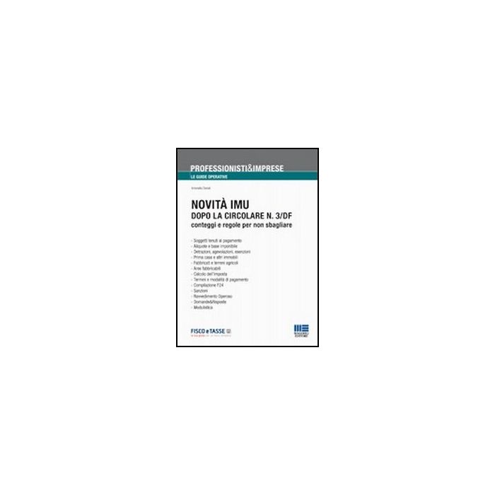 La circolare n. 3/df del 18 maggio 2012 ha fornito gli ultimi chiarimenti circa l'applicazione dell'imu per quanto riguarda il 2012, prevedendo un acconto con aliquote uguali per tutti e un saldo con aliquote fissate dai comuni di appartenenza, che hanno tempo fino al 30 settembre per approvarle. Nel libro, tutto quello che occorre sapere sulle regole per l'applicazione dell'imposta per evitare esborsi non preventivati, le modalità per mettere in regola gli immobili rurali ai fini delle agevolazioni previste, il nuovo modello f24 per il pagamento dell'imu e una serie di risposte a casi concreti.
