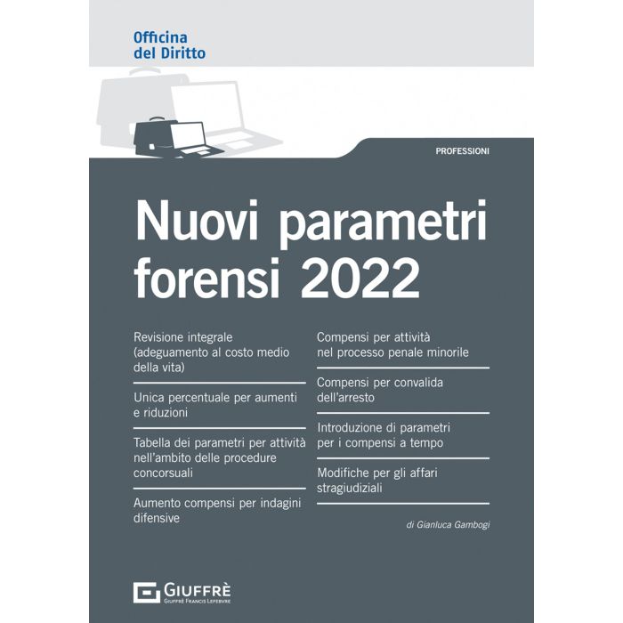 Officina del diritto: è uno strumento di lavoro e di studio pensato per arricchire le proprie conoscenze giuridiche attraverso un sistema di lettura strutturato su più livelli: uno più immediato che consente di focalizzare i concetti "guida" di una precisa fattispecie giuridica con l'utilizzo di esempi, tavole sinottiche, schemi, formule, quesiti, mappe giurisprudenziali, e un altro più approfondito che illustra organicamente la materia e nel quale si rinvengono informazioni puntuali e chiarimenti mirati di pronta fruibilità. L'opera "Nuovi parametri forensi 2022" affronta le seguenti tematiche: Revisione integrale (adeguamento al costo medio della vita)- Unica percentuale per aumenti e riduzioni - Tabella dei parametri per attività nell¿ambito delle procedure concorsuali - Aumento compensi per indagini difensive - Compensi per attività nel processo penale minorile - Compensi per convalida dell¿arresto - Introduzione di parametri per i compensi a tempo - Modifiche per gli affari stragiudiziali