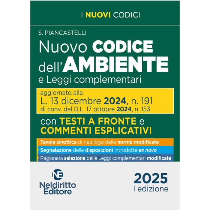 Con l'obiettivo di implementare la tutela ambientale, razionalizzare i procedimenti di valutazione e autorizzazione, attuare gli interventi di bonifica di siti contaminati e di dissesto idrogeologico oltre che di promuovere l'economia circolare, il D.L. 17 ottobre 2024, n. 153, convertito nella legge 13 dicembre 2024, n. 191 ha modificato in maniera significativa il Codice dell'ambiente e la normativa complementare. Il Volume Codice dell'ambiente e Leggi complementari, con testi a fronte e commenti esplicativi, Neldiritto Editore, rivolto ad avvocati, magistrati, studiosi e operatori del settore, consente di visualizzare in modo chiaro e immediato tutte le novità introdotte dalla legge 13 dicembre 2024, n. 191.Il Codice è articolato in due Parti. La Prima reca per intero il Codice dell'ambiente, come modificato dalla riforma del 2024. Il Volume contiene: testi a raffronto con evidenziazione delle modifiche apportate; puntuali e sistematici commenti esplicativi delle innovazioni; segnalazione delle disposizioni introdotte ex novo; apposita tavola sinottica, posta in apertura della prima Parte, recante un riepilogo di tutte le disposizioni modificate, utilissima per avere immediata contezza delle novità. La seconda Parte dà invece conto delle modifiche introdotte dalla legge 13 dicembre 2024, n. 191, alle principali leggi complementari collegate. Completa il Volume l'Indice analitico.