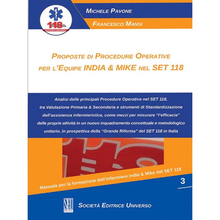 Perché un testo del genere nel panorama della letteratura di settore? Partendo dall'interrogativo, gli Autori, Michele Pavone e Francesco Mansi, evidenziano carenze specifiche di tematiche del genere. Cercano, di dare risposte "omogenee" e possibilmente soddisfacenti all'interrogativo. Scelgono di analizzare un tema attualissimo ed estremamente arduo per la sua natura, dove si assiste a realtà Regionali fortemente variegate e disomogenee a "macchia di leopardo", dove ogni singola Provincia nell'ambito della propria Regione d'Italia, esprimono LEA Organizzazioni - Gestionali "differenti" a "geografia variabile" nel Set 118 Nazionale. Ecco perché si giustifica a pieno titolo un lavoro del genere. Focalizzando l'attenzione sullo stato dell'arte, evidenziando "carenze ataviche" di sistema, proponendo (o per lomento cercando) in modo del tutto "univoco" e soprattutto condiviso nuovi "strumenti della standardizzazione nel set 118". come ad ed es, linee guida, raccomandazioni, percorsi clinico - assistenziali, protocolli (clinical pathway), e procedure. Definiti dagli Autori, "Ferri del Mestiere", fondamentali nel bagaglio formativo - lavorativo tecnico - relazionare degli Operatori Sanitari del set 118 infermieri India & Mike da utilizzare sempre in ambito clinico ed organizzativo. Con questi "nuovi" Strumenti, in forma di "Proposte Operative", gli Autori partendo dalla loro realtà territoriale (Area Capitanata Nord della Provincia di Foggia), vogliono fortemente "valorizzare" le Competenze Specifiche degli Infermieri afferenti al SET 118 nell'ambito dell'assistenza sanitaria, in grado di produrre a favore delle persone assistite - "i propri risultati di salute sostenuti da prove clinico di efficacia, le cosiddette" "evidence - based nursing" in una nuova ottica, in attesa che il Governo, prenda atto "fattivamente" della mozione presentata in Senato la Senatrice Maria Domenica Castellone, capo gruppo del Movimento Cinque Stelle, "disegno di legge" - riforma del set 118, che riformi tutto il sistema.