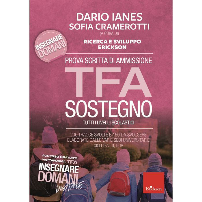 Dall'analisi approfondita di tutti i quesiti elaborati dai vari Atenei nei precedenti cicli di TFA (Tirocinio Formativo Attivo) Sostegno, la Ricerca e Sviluppo Erickson ha selezionato i più significativi e salienti, presentando in questo volume 200 tracce a risposta aperta, di cui si fornisce lo svolgimento, e oltre 150 da svolgere e su cui esercitarsi. Rivolto a coloro che vogliono prepararsi a superare con successo la prova scritta per accedere ai Corsi di specializzazione per le attività di sostegno nelle scuole dell'infanzia, primaria, secondaria di I e II grado, il manuale propone un'ampia trattazione dei principali argomenti richiesti dal programma d'esame. Nel testo è inoltre incluso un codice che permette di accedere gratuitamente alla piattaforma digitale Insegnare domani - TFA sostegno e consultare i materiali dei corsi di specializzazione in sostegno didattico.
