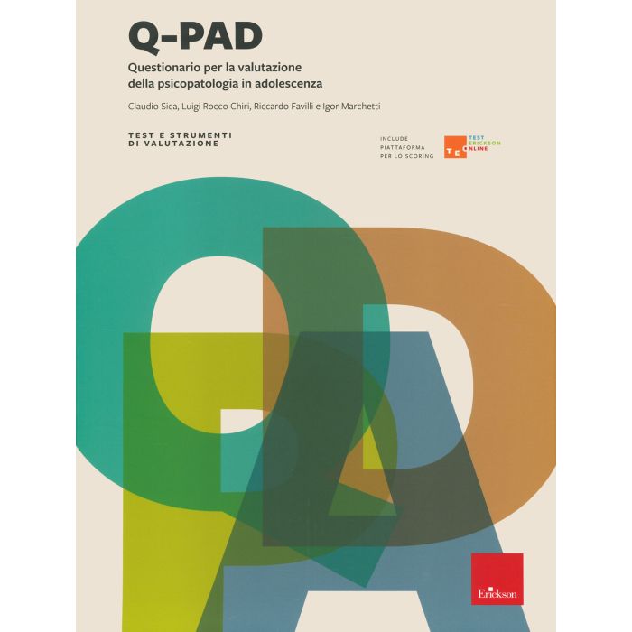 Il Q-PAD è un questionario finalizzato alla valutazione ad ampio spettro della psicopatologia e alla misurazione del livello di adattamento e del più generale stato di benessere in adolescenza. A differenza di altri strumenti nati in ambito strettamente psichiatrico, il suo utilizzo può essere esteso a molti contesti diversi non necessariamente clinici (scuola, comunità, counseling, orientamento, ricerca, ecc.). La sua brevità, 81 item, la semplicità di somministrazione e la chiarezza degli item sono state appositamente pensate per adattarsi agli adolescenti che generalmente affrontano questo tipo di prove con diffidenza e scarsa motivazione. Validato su un campione di 1454 soggetti di età compresa tra i 14 e i 19 anni e agevole anche nello scoring, il questionario consente una rapida interpretazione dei risultati che danno indicazioni sul livello di disagio nelle 9 scale indagate: ansia, depressione, insoddisfazione corporea, abuso di sostanze, conflitti interpersonali, problemi familiari, incertezza per il futuro, rischio psicosociale, autostima e benessere. Il volume include l'accesso omaggio alla piattaforma TEO - Test Erickson Online, un ambiente digitale dedicato che con una procedura guidata supporta l'utente dalla somministrazione delle prove, allo scoring e al report finale.