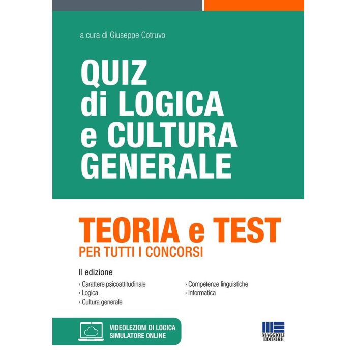 Il testo affronta nella prima parte i quesiti a risposta multipla di carattere psicoattitudinale e di logica: Ragionamento numerico (serie numeriche classiche); Ragionamento numerico-deduttivo; Serie numeriche figurali; Serie alfabetiche e alfanumeriche; Serie figurali; Grammatica; Comprensione verbale; Analogie e abbinamenti; Ragionamento verbale; Ragionamento critico-verbale; Deduzioni; Negazione logica; Sillogismo; Relazioni di ordine e grandezza; Insiemi; Ragionamento critico-numerico; Attenzione ai particolari. Per ogni tipologia il testo offre numerose batterie di esercizi, tratte anche da prove ufficiali, con le soluzioni e i commenti esplicativi che chiariscono il procedimento logico, forniscono consigli e spiegano le tecniche di risoluzione. La seconda parte presenta una sezione di quesiti a risposta multipla in cultura generale e competenze linguistiche (letteratura italiana, grammatica italiana, storia, storia dell'arte, geografia, educazione civica), lingua inglese e informatica. Disponibile nella sezione online collegata al volume un utile simulatore di quiz e alcune videolezioni di logica a cura di Giuseppe Cotruvo.