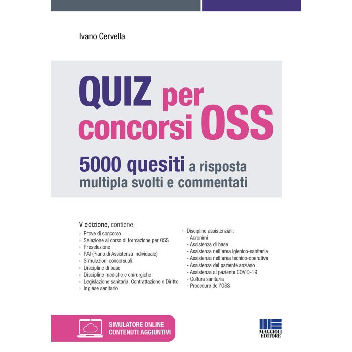 Il volume è uno strumento utile per coloro che si apprestano a sostenere una selezione in un concorso pubblico o ad un corso di formazione per OSS. Il testo contiene oltre 5000 quesiti a scelta multipla suddivisi per materia e ampiamente commentati, in modo da favorire un ripasso sistematico degli argomenti. È suddiviso in 10 parti: la prima parte descrive il percorso del candidato alla prova concorsuale (profilo professionale, attività e competenze dell'OSS, prove concorsuali, SPID, graduatorie e ricorso, metodo per ottimizzare lo studio); > la seconda parte raccoglie 300 quiz inerenti la prova di ingresso al corso di formazione per OSS e a seguire illustra il Piano di Assistenza Individuale (PAI) con alcune esercitazioni; la terza parte raccoglie i quesiti delle prove preselettive per poter accedere al concorso; la quarta parte contiene vere e proprie simulazioni delle prove di concorso, dove il candidato si metterà alla prova; la quinta parte è dedicata alle discipline di base (area socio-psico-pedagogica, biologia e genetica, chimica, cultura generale e logica, fisica e matematica, informatica, educazione civica, geografia, lingua italiana, statistica, storia e filosofia); la sesta e settima parte affrontano le discipline mediche e chirurgiche (anatomia e fisiologia, medicina e chirurgia); l'ottava parte è dedicata alle discipline assistenziali (acronimi, approfondimenti di cultura sanitaria, assistenza nell'area igienico-sanitaria, assistenza nell'area tecnico-operativa, assistenza di base, assistenza del paziente anziano, procedure assistenziali, assistenza al paziente COVID-19); la nona parte contiene una selezione di quiz riguardanti la legislazione sanitaria e sociale, la contrattazione e il diritto; la decima parte raccoglie frasi e termini di inglese sanitario e quiz a scelta multipla. Nella sezione online, raggiungibile seguendo le istruzioni riportate in fondo al libro, sono disponibili ulteriori quiz, simulazioni e contenuti aggiuntivi di interesse per la preparazione al concorso.