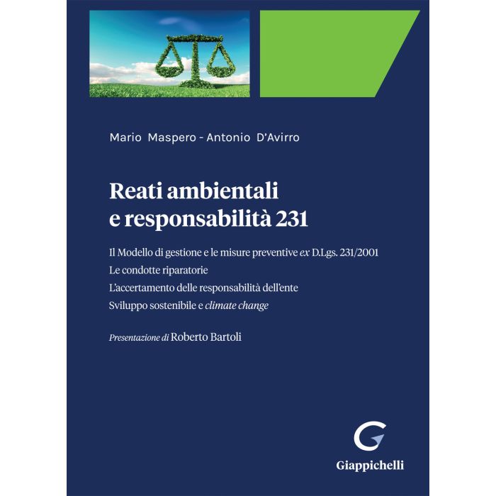 "Il volume elabora tutte le risposte necessarie per quanti (avvocati, ODV, funzioni aziendali interne) impegnati sul tema dei reati ambientali vogliono anche avere una immediata visione delle problematiche e delle implicazioni che la persona giuridica deve affrontare (azioni preventive, strategie difensive, condotte riparatorie, rischi di sanzioni interdittive o di misure di prevenzione, ecc.). Il concetto di riparazione del danno cagionato, espresso in termini anche diversi nelle varie fattispecie a rilevanza 231 che sono trattate nel presente lavoro consente di riannodare i fili fra modello di organizzazione, gestione e controllo dell'ente, sistema di gestione ambientale (SGA) e le attività di compliance. Solo con l'attività di riparazione del danno e con la spinta da parte della societas verso questo tipo di approccio l'attività di impresa nel suo insieme può dirsi sostenibile. Perché se un reato è stato commesso e se il Modello non è stato in grado di prevenire eventi dello stesso tipo di quello che si è verificato, oltre al rafforzamento delle regole di compliance, oltre alle modifiche migliorative del MOGC è necessario attuare un sistema 231 maggiormente orientato in senso riparatorio che possa ricucire lo "strappo" cagionato all'ambiente dalla commissione del reato" (Tratto dalla Presentazione di Roberto Bartoli).