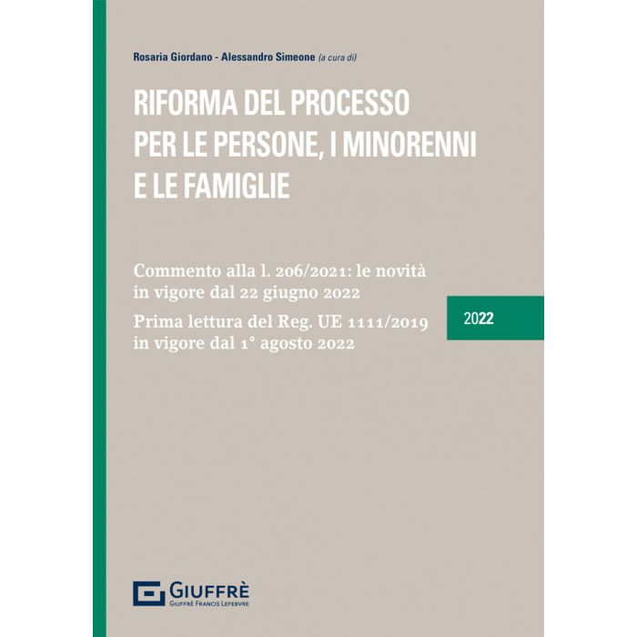 Il diritto di famiglia con la legge 206/2021 subisce un importante rinnovamento destinato ad incidere profondamente sul processo delle relazioni familiari e quello relativo ai minorenni. Il volume intende fornire un valido strumento a tutti coloro, avvocati, studiosi e interpreti, che vogliano indagare i contenuti e le caratteristiche delle norme introdotte dalla l. 206/2021 e in vigore dal 22 giugno 2022 in tema di persone, famiglie e minori. Il testo è altresì arricchito da alcune riflessioni sul Reg. UE 1111/2019, in vigore dal 1 agosto 2022, contenente novità per tutti quei procedimenti in tema di giurisdizione, riconoscimento ed esecuzione delle controversie in materia di separazione e divorzio e di responsabilità genitoriale, nell'ottica di una maggiore integrazione tra i sistemi giuridici europei quando si tratti di tutelare un minore a seguito di disgregazione del nucleo familiare.