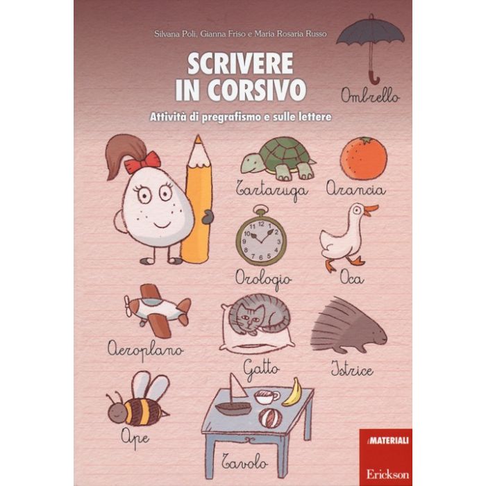 Nelle prime fasi di scolarizzazione, il passaggio dalla scrittura in stampato al corsivo può provocare difficoltà di grafia, perché il bambino abbandona un automatismo acquisito per assumere un nuovo pattern di movimenti. L'innovativo programma qui presentato suggerisce di preparare il bambino a scrivere direttamente in corsivo, carattere che offre numerosi vantaggi. Il testo, destinato agli alunni dell'ultimo anno della scuola dell'infanzia e del primo della primaria, si articola in tre parti con attività specifiche su: pregrafismo, vocali, consonanti. Le schede operative relative a vocali e consonanti presentano una serie di esercitazioni, quali: esercizi di ripasso sul segno già tracciato della lettera, esercizi di riconoscimento e riproduzione della lettera sia all'inizio che all'interno della parola, attività di integrazione secondo il processo visivo-uditivo. Completano il volume 21 schede da esporre in aula, colorate e plastificate, raffiguranti tutte le lettere dell'alfabeto riportate nei quattro caratteri.