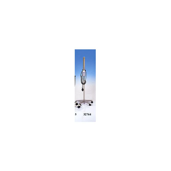Apparecchio ideale per ospedali e sale operatorie, basamento su cinque ruote, con supporto per bracciale in tessuto con chiusura velcro a due tubi.