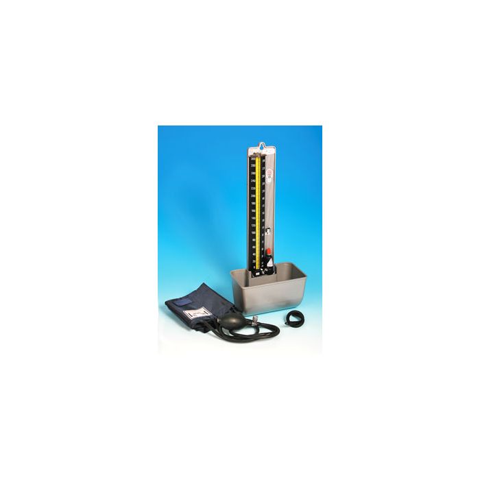 Sfigmomanometro murale con scala 0-300 mmHg, bracciale in nylon con chiusura velcro e scomparto portaoggetti.