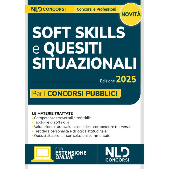 Il Volume Soft skills e quesiti situazionali per i concorsi pubblici, NLD Concorsi 2025, supporta chi si prepara ad affrontare le prove concorsuali che includono la valutazione delle abilità personali e relazionali (c.d. soft skills), sempre più centrali nei percorsi di selezione. Oltre alla preparazione tecnica sulle materie previste per ciascun profilo, i candidati devono dimostrare di possedere doti come la gestione efficace delle relazioni interpersonali, la capacità di affrontare situazioni complesse o stressanti, la propensione al lavoro in gruppo e l'inclinazione al coordinamento e alla guida. Queste caratteristiche vengono spesso indagate tramite test attitudinali e, in particolare, quesiti situazionali, che richiedono non solo intuito, ma anche l'applicazione di strategie ben definite per essere affrontati con successo. Il volume è così strutturato: Parte I (Competenze trasversali e soft skills), recante la classificazione e il quadro delle competenze; Parte II (Tipologie di soft skills), contenente una ricognizione delle principali tipologie di competenze trasversali; Parte III (Valutazione e autovalutazione delle competenze trasversali), che si sofferma su gli strumenti di valutazione e autovalutazione delle soft skills rivolgendosi a studenti e dirigenti pubblici e offre modelli esemplificativi dei test situazionali somministrati nei principali concorsi pubblici. La parte contiene, inoltre, un approfondimento sui test della personalità , i quiz di logica attitudinale e il colloquio; Parte IV (Quesiti situazionali), che offre batterie di quesiti situazionali con soluzioni commentate. Il Manuale permette, infine, l'accesso ad una estensione online, consultabile con apposita password, per rimanere aggiornati sulle materie oggetto d'esame.