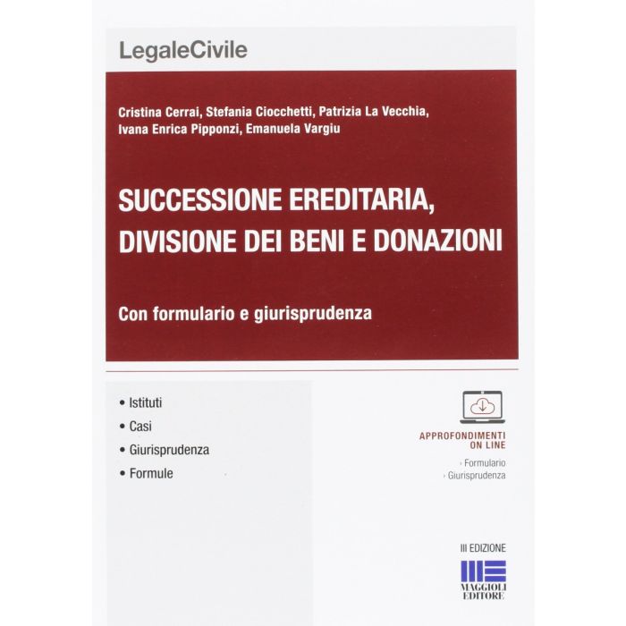 Sono in tal modo affrontati i seguenti argomenti: divieto di patti successori, poteri del chiamato, capacità di succedere e indegnità; accettazione dell'eredità, pura e semplice e con beneficio di inventario; separazione dei beni del defunto da quelli dell'erede; rinunzia all'eredità; eredità giacente; tutela della qualità di erede; successione dei legittimari; successione legittima; successione testamentaria; divisione; patto di famiglia; donazioni. Al volume sono collegati importanti risorse on line: grazie al codice riportato in coda al testo, dalla pagina www.approfondimenti.maggioli.it è possibile accedere all'intero formulario, in formato editabile e stampabile, e alla giurisprudenza di riferimento.
